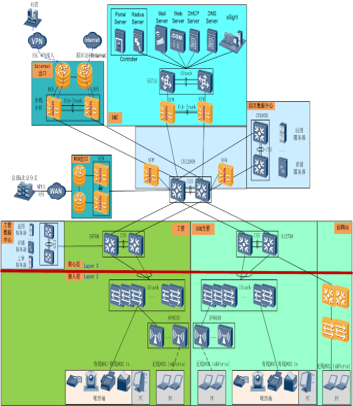 工管網設備按照指定VLAN+IP對應接入,WAN網和分支接入用戶可訪問一定的資源。
